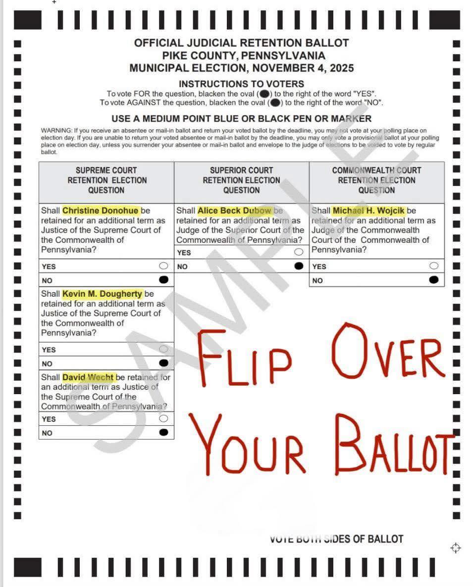 If voting by paper ballot at polling location or with a mail-in ballot, don’t forget to turn it over, the retention questions are on the back side.