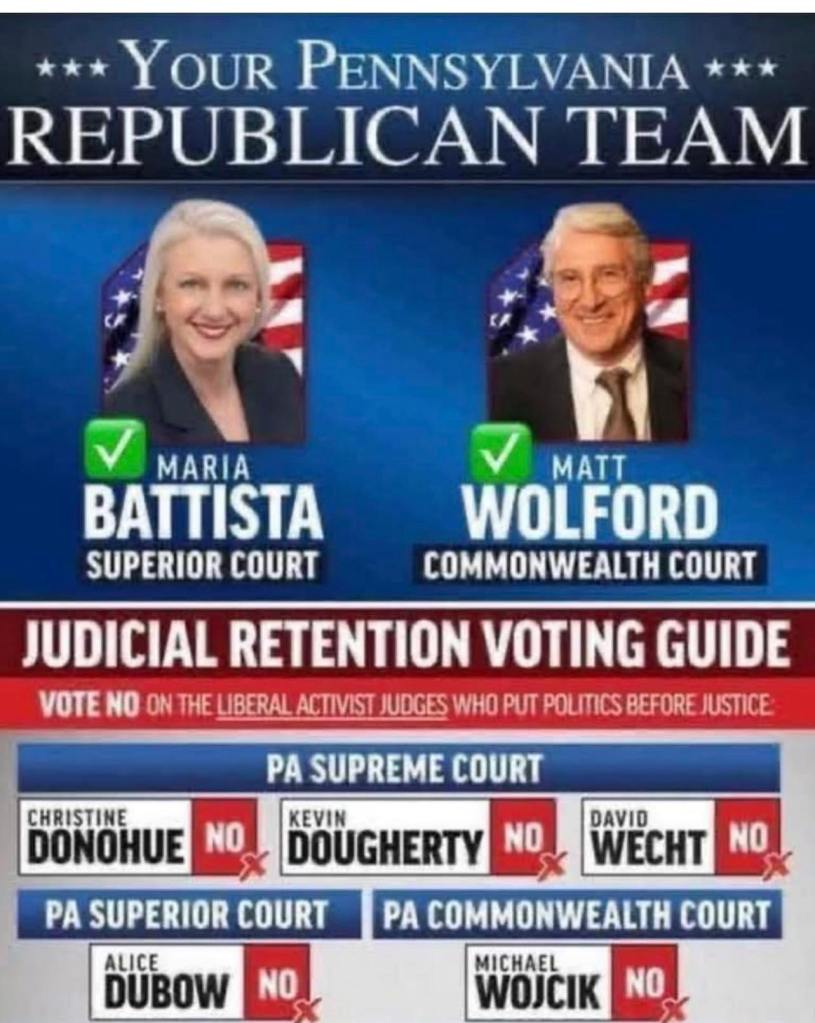 The judges up for retention are the ones who shut down schools on 2020. Would not allow you to visit loved ones in hospitals and nursing homes in 2020. They are the ones who shut down businesses in 2020 and many never recovered. They drew the redistricting map when the constitution clearly states it is the legislatures job, and judges are to only rule on law. They also extended the dates to return ballots after Election Day in 2020. If we don’t vote them out they will be in office until 2035. Vote NO!