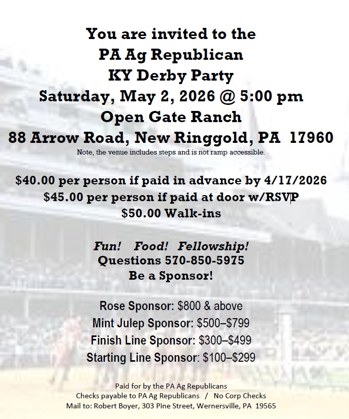 Share this: Share on Facebook (Opens in new window) Facebook Share on X (Opens in new window) X Like Loading... Related Make your reservations for the PA Ag Republican KY Derby Party May 2, 2026. Fun, Food, & Fellowship with other Republicans! March 7, 2026 / * * *