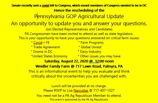 Network with other PA Ag Republicans and Legislators. Learn what DC and Harrisburg representatives are doing for you and how you can make difference.